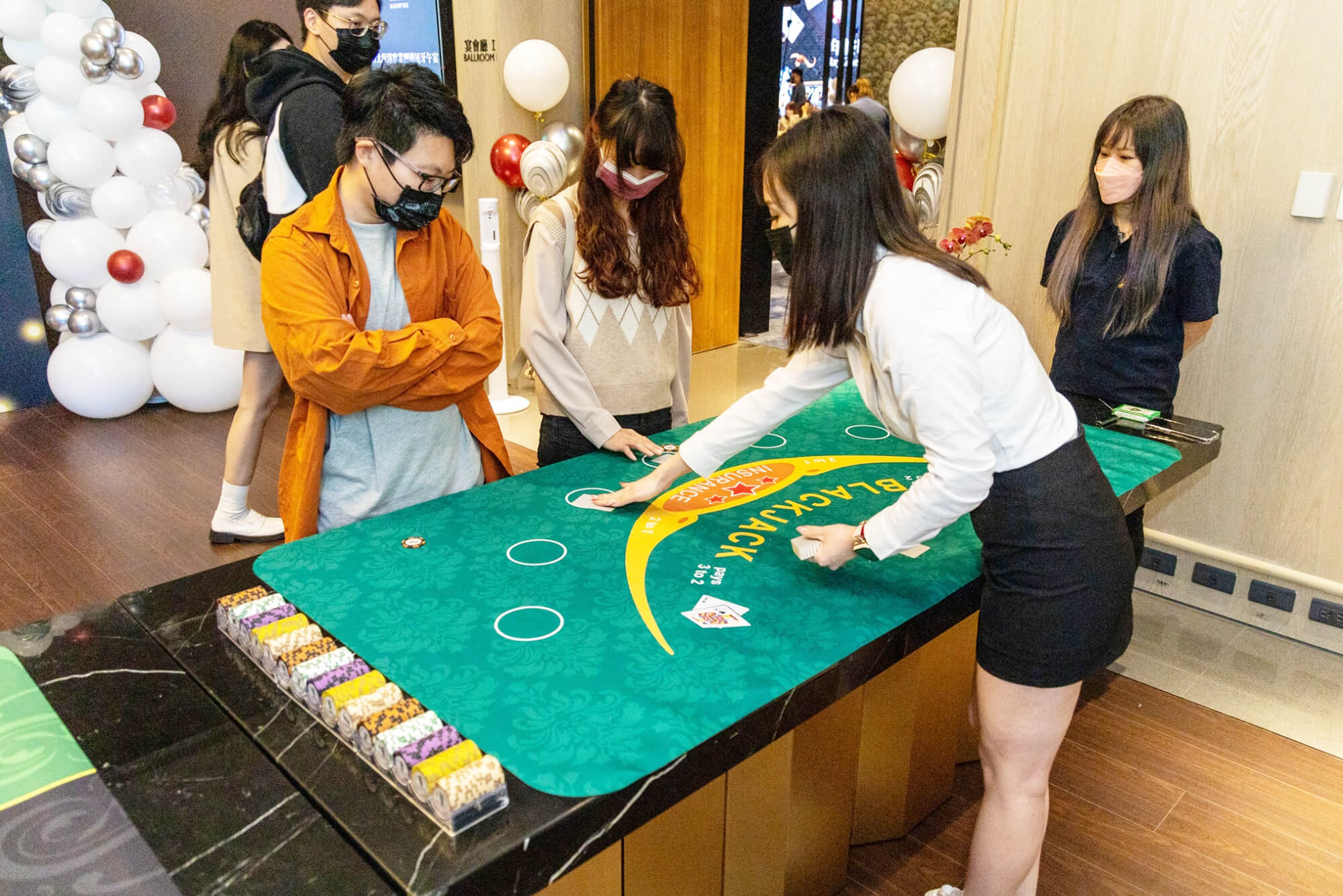 在婚禮現場,我們精心打造了一個夢幻的空間。色彩繽紛的氣球點綴著整個場地,讓每個角落都充滿了節日的氛圍。賓客們在享用美味的Buffet美食的同時,也可以在專業的荷官指導下參與各種Casino遊戲,增添了一份刺激和樂趣。