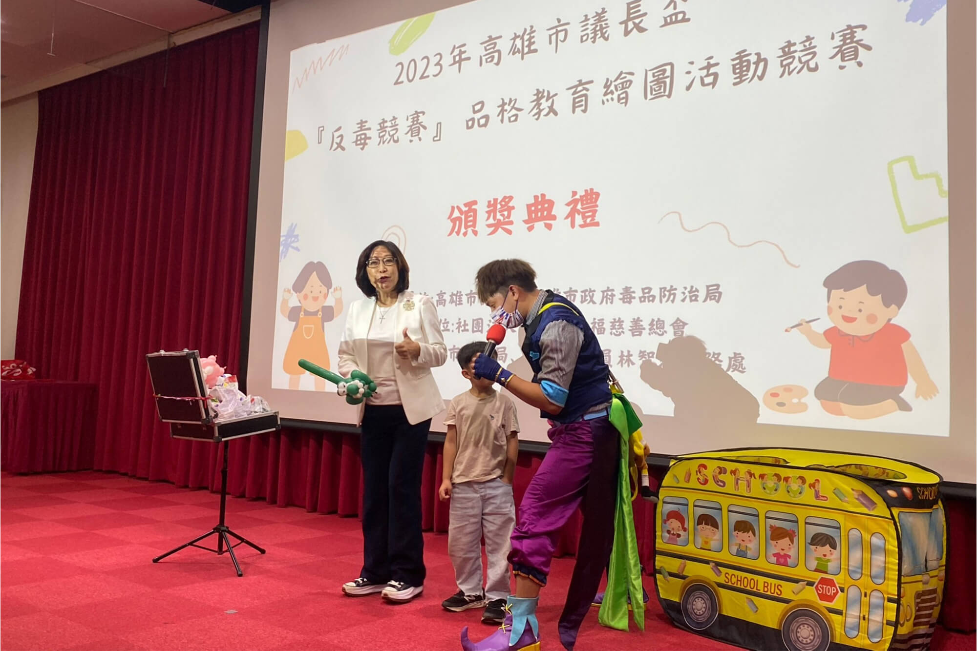 頒獎典禮中,我與康裕成議長、毒防局林局長、教育局專員一同為這群優秀的小藝術家們頒發獎項。