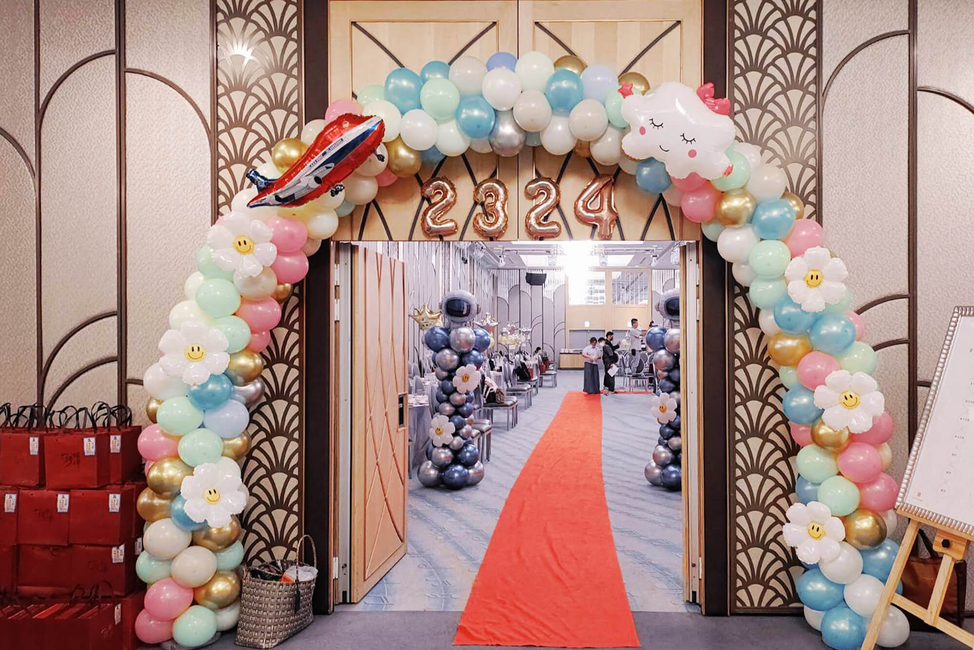 在布置過程中,我們不僅重視整體視覺效果,更關注細節與結構的穩固性,確保拱門、球柱及氣球道具能在儀式全程中完美呈現。當現場布置完成時,氣球拱門與球柱瞬間成為會場的亮點,來賓們紛紛在拱門下合影留念,而交接道具則成為象徵性的焦點,為交接儀式增添了許多難忘的回憶。