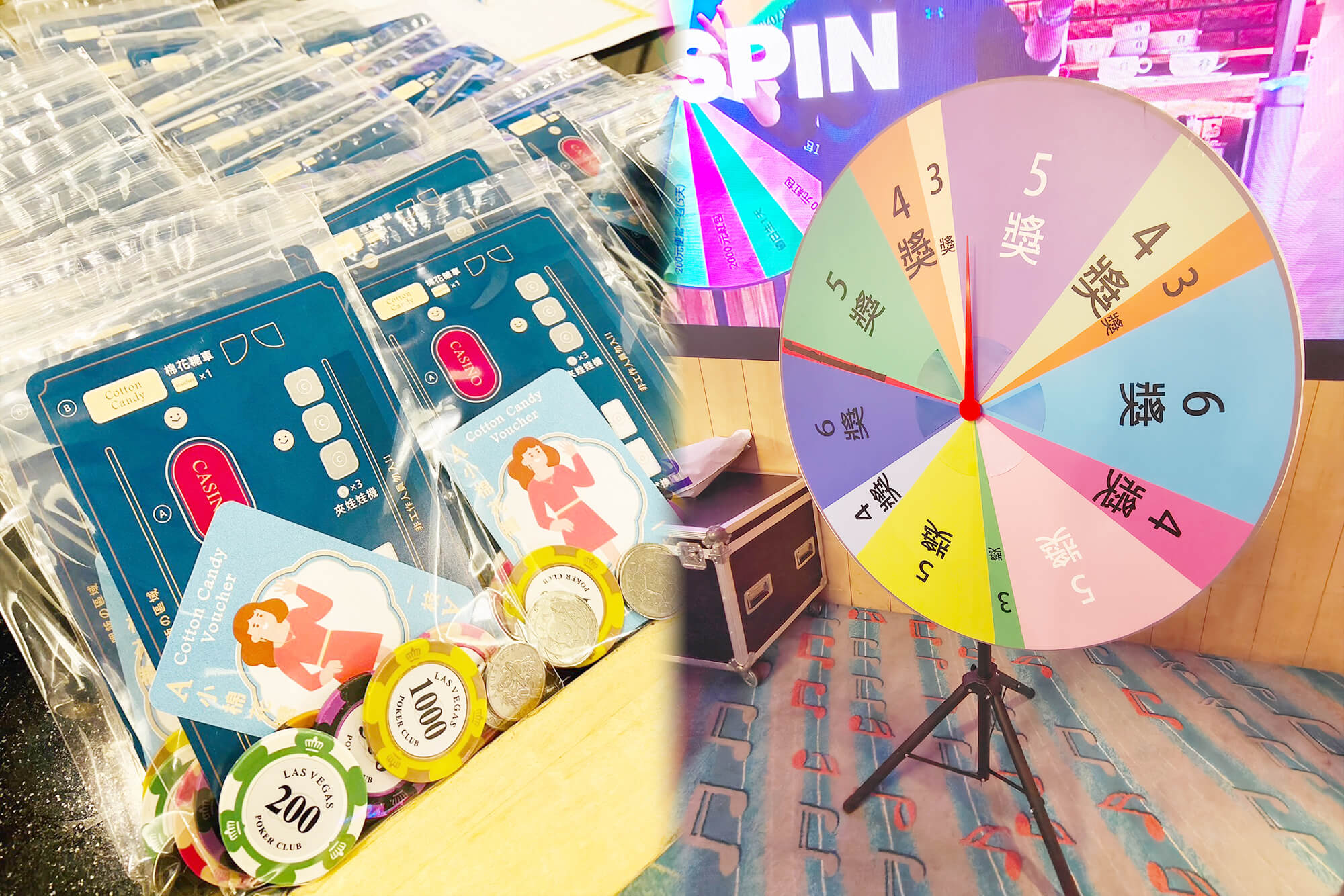 為了營造濃厚的Casino氛圍,我們在場地佈置上花費了大量心思。背板以氣球、撲克牌、骰子等元素進行裝飾,並配合特殊的燈光效果,呈現出讓人流連忘返的視覺體驗。