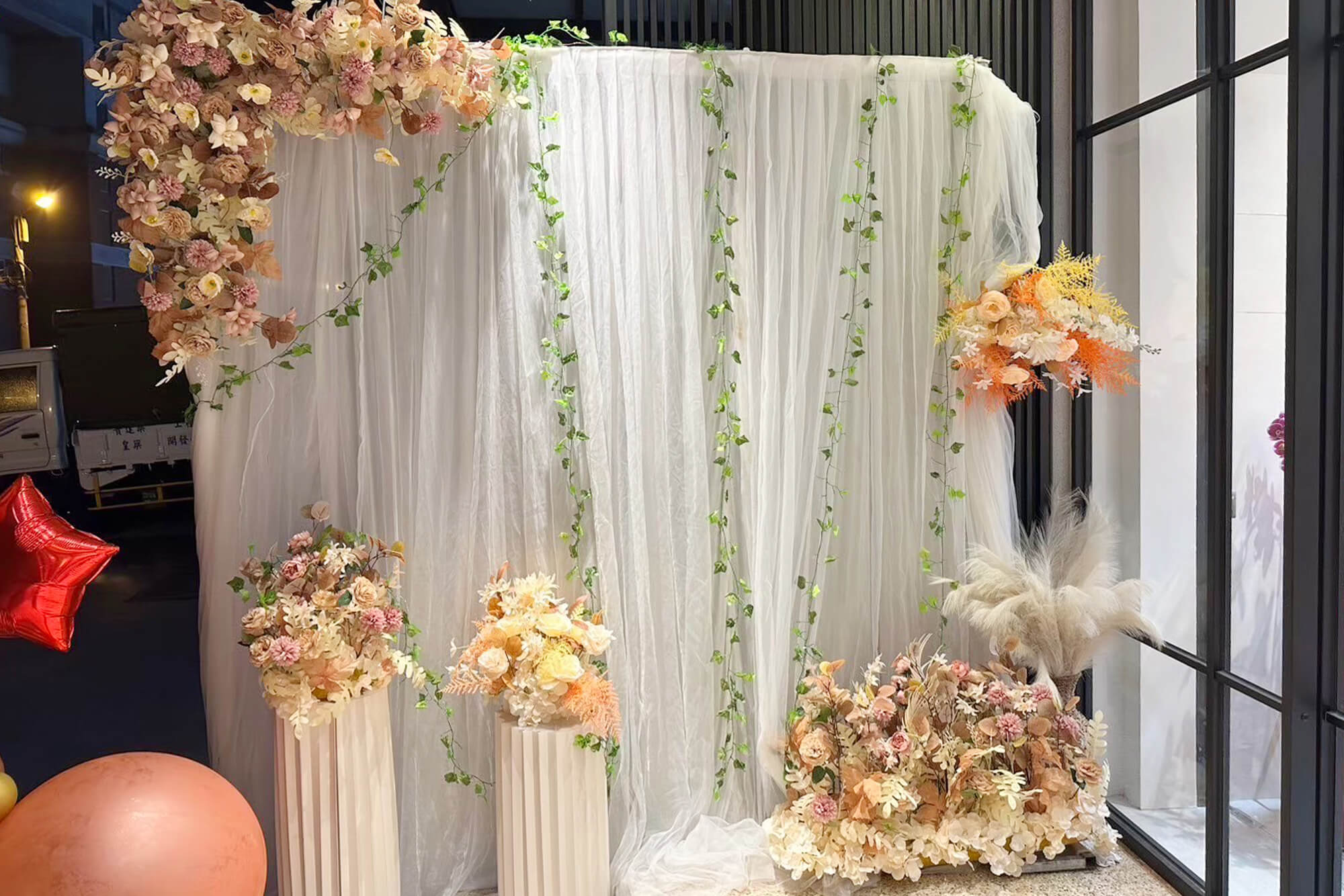 氣球藝術佈置:以粉嫩與金屬色系交錯設計氣球拱門,結合紅銀星星氣球,製造喜氣亮點。