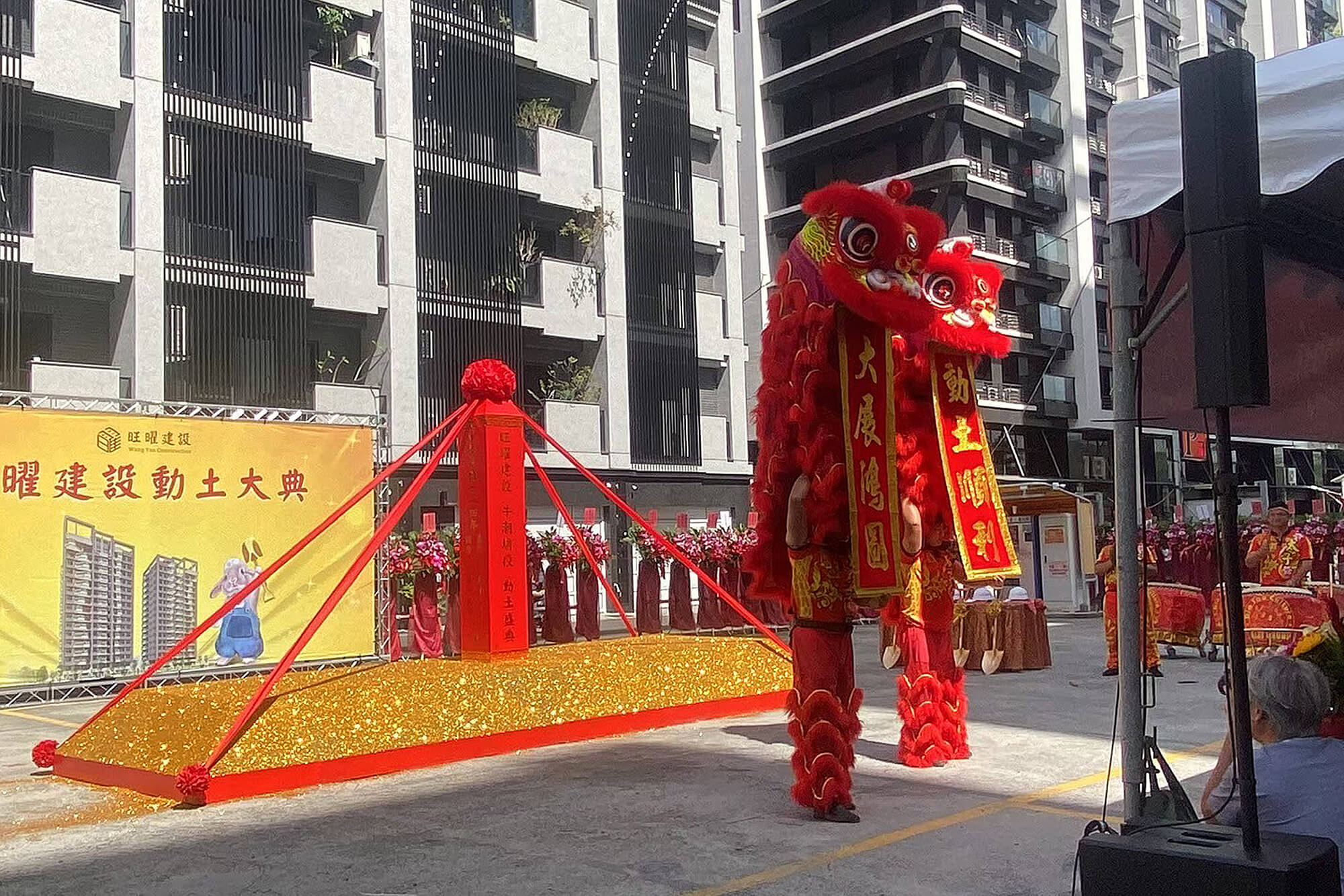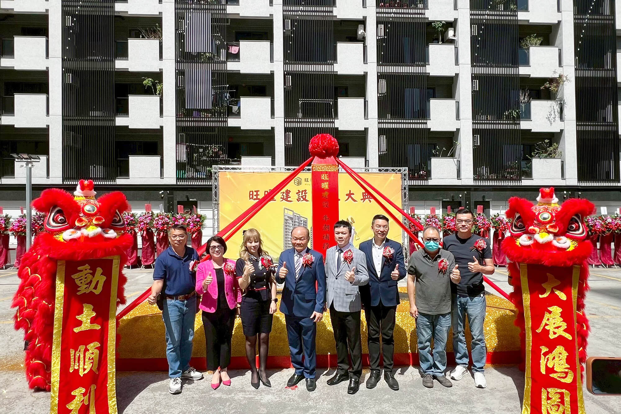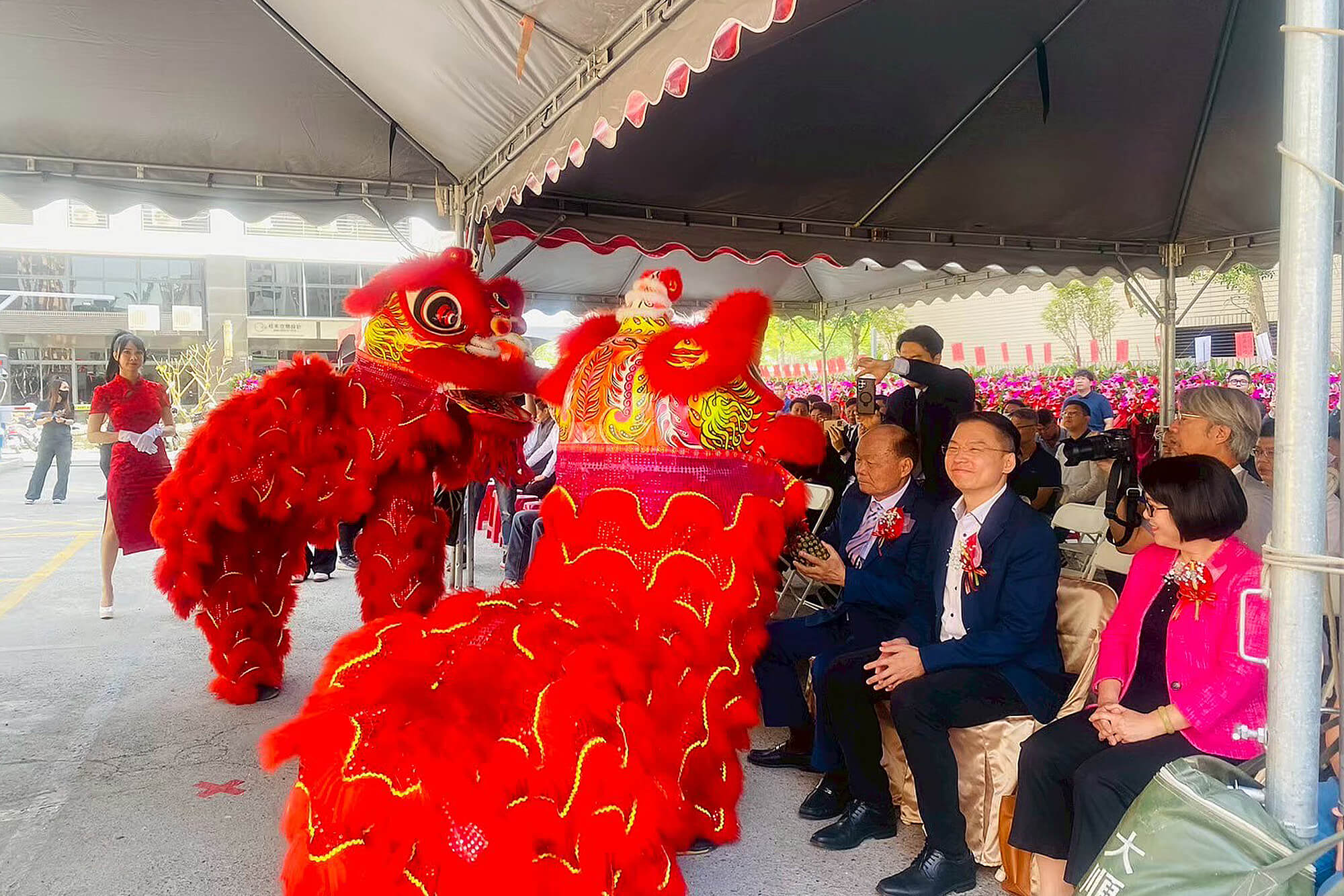 活動由磅礡的擊鼓表演揭開序幕,鼓聲振奮人心,瞬間凝聚現場氣氛。隨後「祥獅獻瑞」演出華麗登場,兩隻彩獅翻騰躍動、寓意吉祥昌隆,貴賓親自接下由醒獅遞來的鳳梨與菜頭,除了有萬事興旺的寓意外,也象徵新案將如雄獅般勇猛邁進。